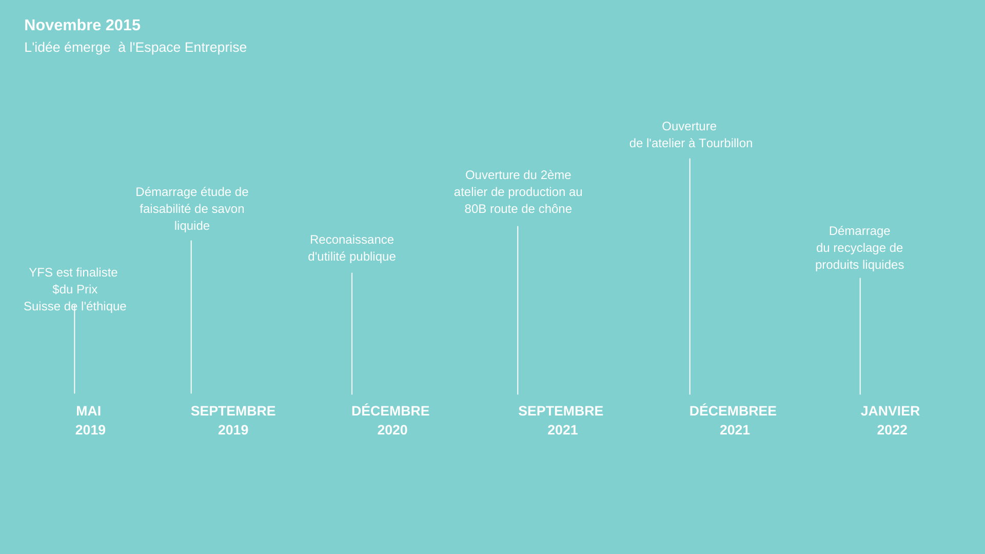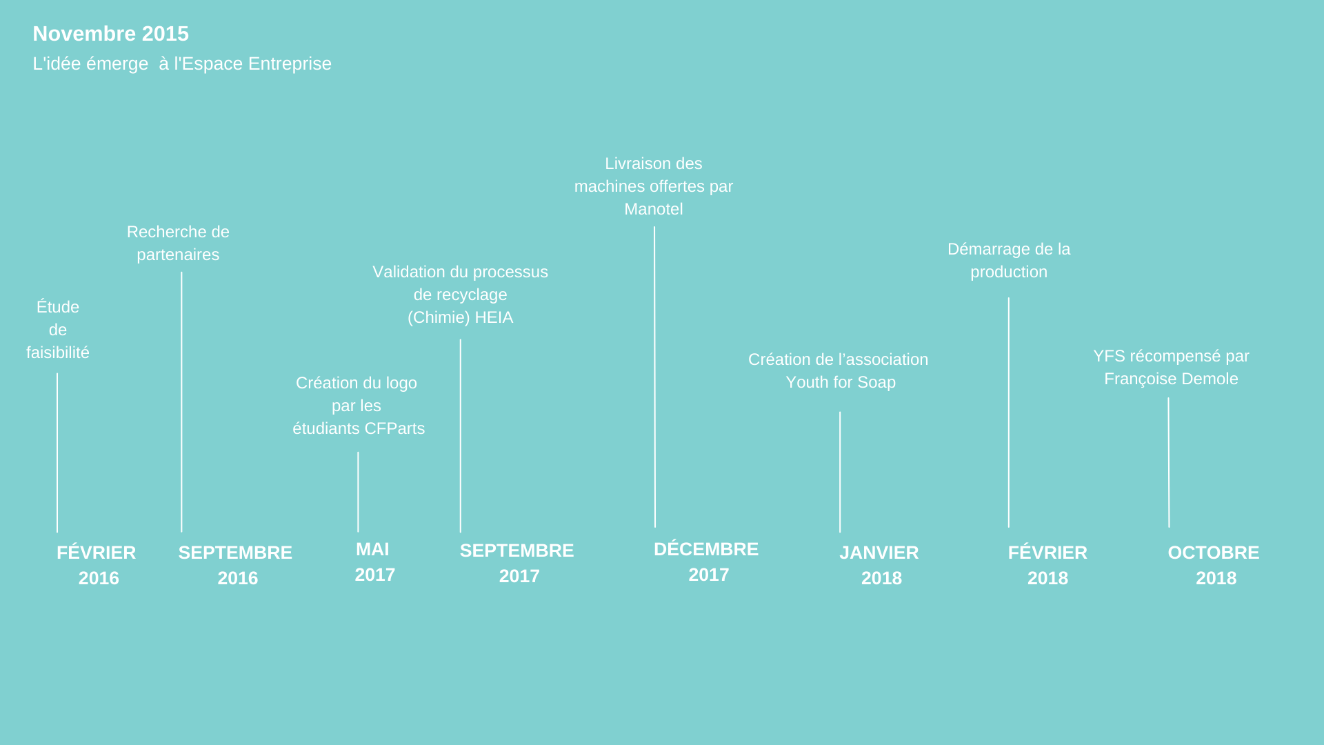 L’idée de Youth for Soap est lancée en novembre 2015 à l’Espace Entreprise. C’est un lieu de formation professionnelle à la pratique commerciale, où les apprentis employés de commerce genevois effectuent des stages pour développer leurs compétences sur le terrain. L’association à but non lucratif voit le jour au printemps 2020 et obtient ensuite la reconnaissance d’utilité publique du canton de Genève.